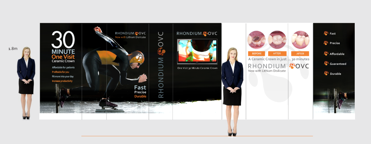 Imagery, expo stand, DM and retail print items for the Mid-Winter Chicago Show - an event for dentists. Rhondium's One Visit Crown is a game changing new crown procedure invented by Dr Simon McDonald.